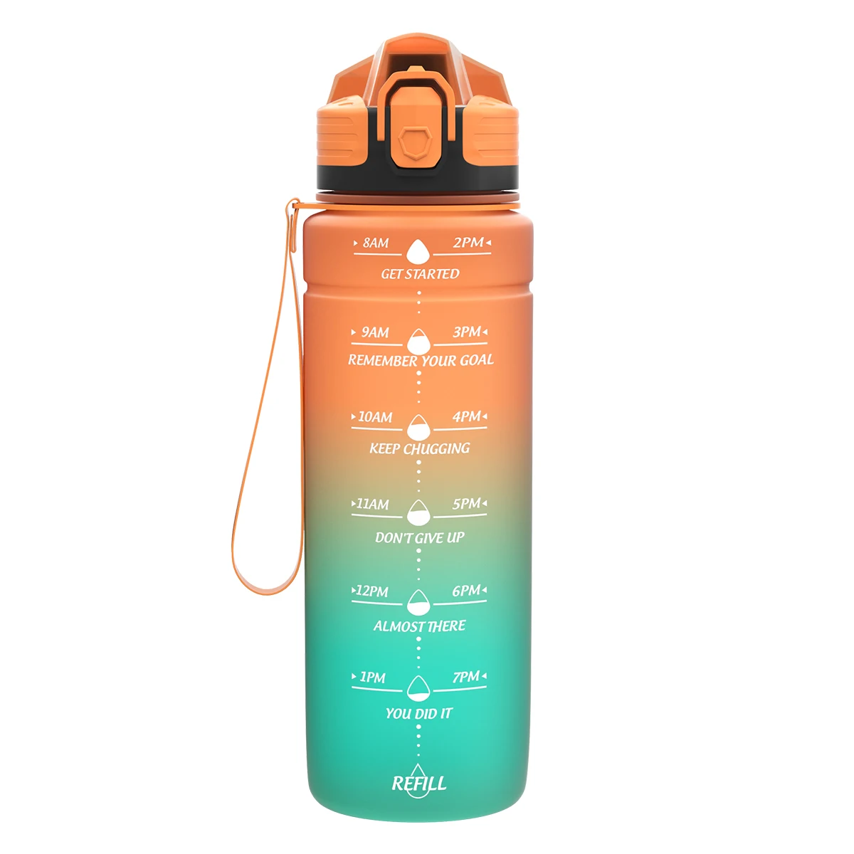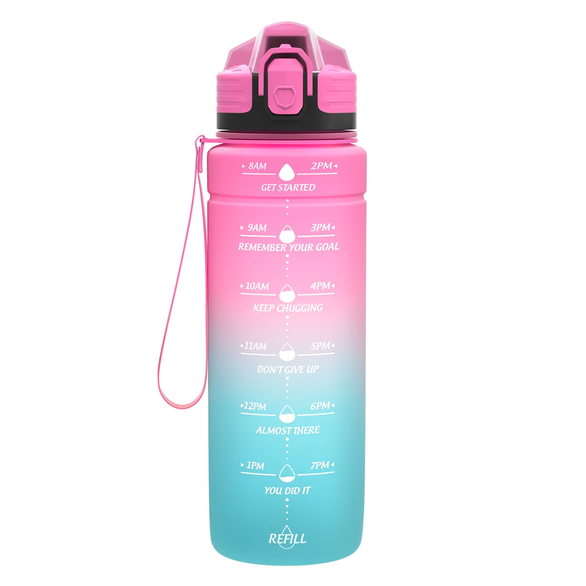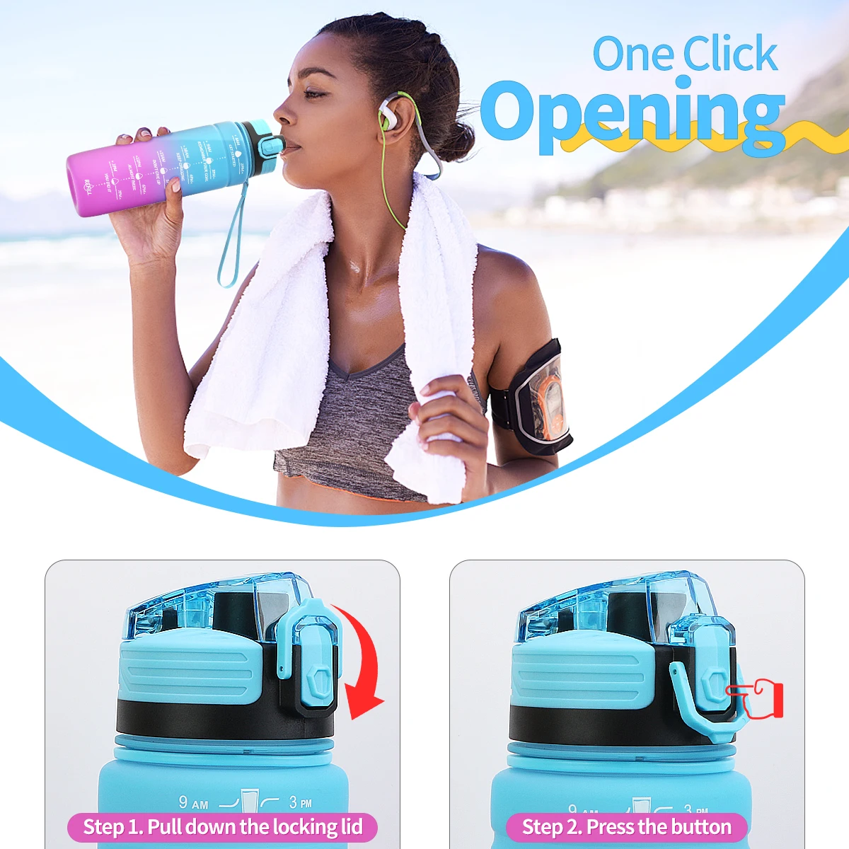 Stay hydrated during all your adventures with our BPA-free sports water bottle, designed for fitness enthusiasts and outdoor lovers alike. Why you'll love it: - Made from high-quality, food-grade Tritan plastic, ensuring safety and durability. - Secure flip-top lid prevents leaks for worry-free hydration. - Motivational time markers and quotes help you track your daily water intake effortlessly. - Trendy colors and two sizes (500ml and 1000ml) to fit your personal style. - Wide mouth design accommodates added fruits or ice for refreshing drinks. This premium water bottle features a comfortable grip with a reflective matte surface and a convenient carry cord, perfect for on-the-go hydration. To use, simply fill your bottle with water, add fruits or ice to your liking, secure the lid, and push the button to open with one hand. Hydrate healthily and live an active lifestyle today! Plus, enjoy peace of mind with our 30-day satisfaction guarantee and a one-year warranty on this product – your happiness is our priority!