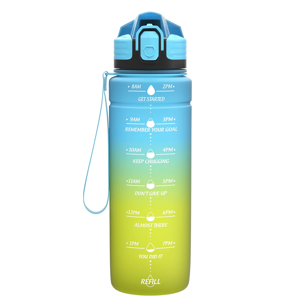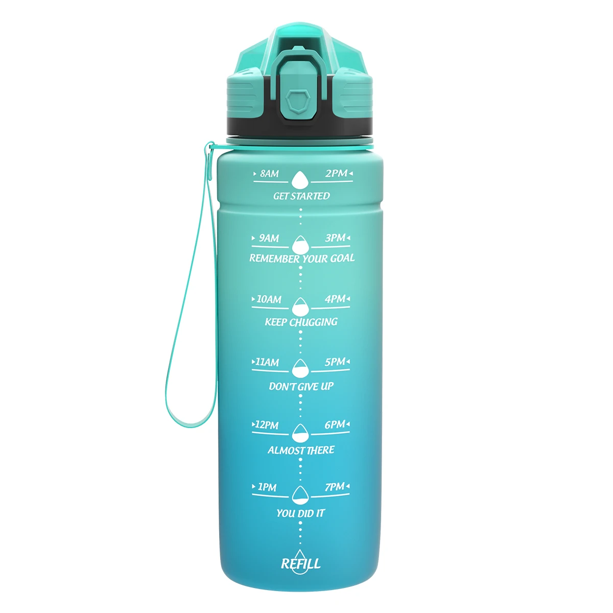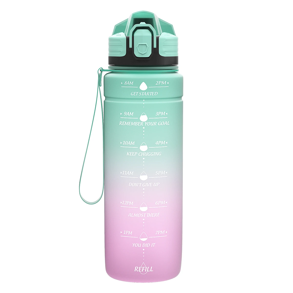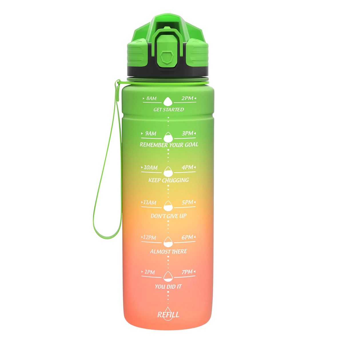 Stay hydrated during all your adventures with our BPA-free sports water bottle, designed for fitness enthusiasts and outdoor lovers alike. Why you'll love it: - Made from high-quality, food-grade Tritan plastic, ensuring safety and durability. - Secure flip-top lid prevents leaks for worry-free hydration. - Motivational time markers and quotes help you track your daily water intake effortlessly. - Trendy colors and two sizes (500ml and 1000ml) to fit your personal style. - Wide mouth design accommodates added fruits or ice for refreshing drinks. This premium water bottle features a comfortable grip with a reflective matte surface and a convenient carry cord, perfect for on-the-go hydration. To use, simply fill your bottle with water, add fruits or ice to your liking, secure the lid, and push the button to open with one hand. Hydrate healthily and live an active lifestyle today! Plus, enjoy peace of mind with our 30-day satisfaction guarantee and a one-year warranty on this product – your happiness is our priority!